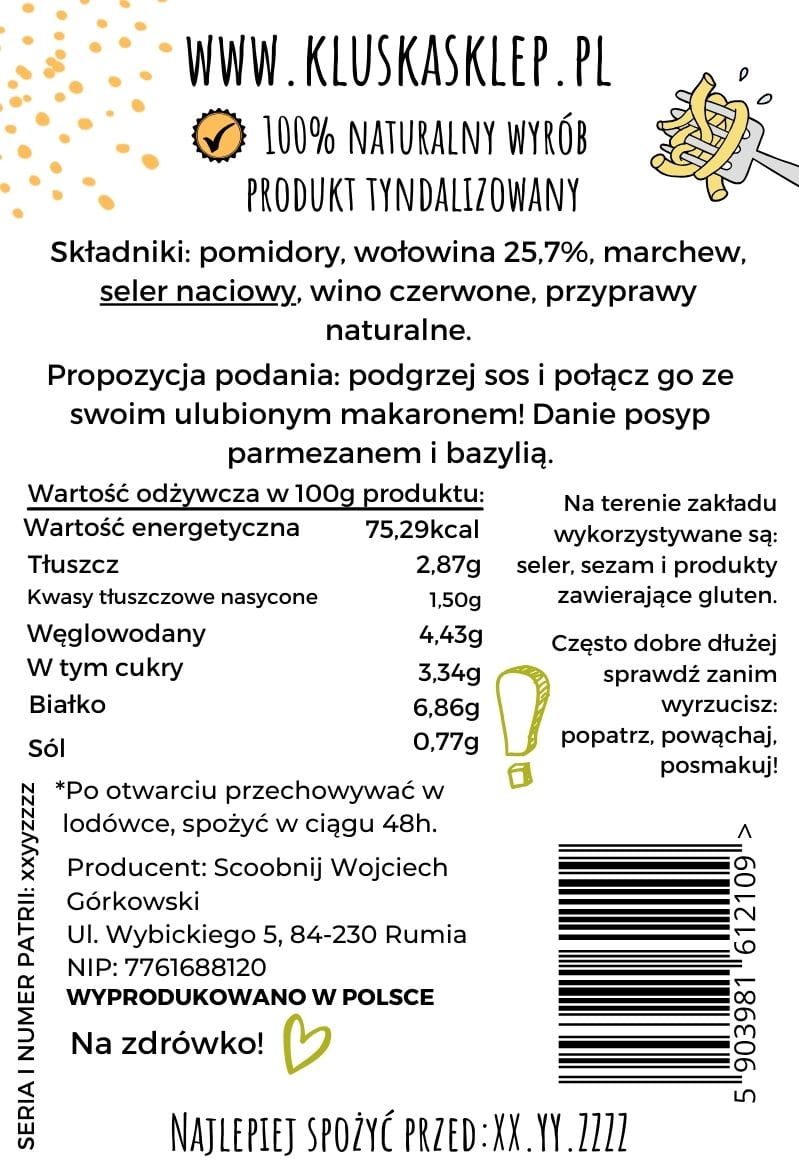 Klasycznie, dla produktów Kluski®, dzięki tradycyjnej metodzie utrwalania żywności - tyndalizacji, nasze wyroby zachowują świeżość przez całe 12 miesięcy, nawet bez konieczności przechowywania w lodówce.howywania w lodówce. Na terenie zakładu wykorzystywane są: seler, sezam i produkty zawierające gluten. Skład oraz wartości odżywcze znajdziesz w galerii zdjęć tego produktu.